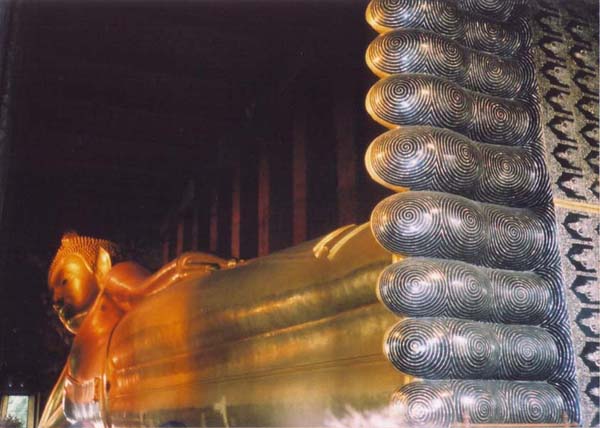 タイの寺院を見ていて感じた事。日本とは全く違うね。煌びやか。日本の場合「ひっそりとたたずんでいる」って感じなんだけど、タイのは「ここに寺院があるぞ〜〜!!!」って主張してるみたい(笑) 寝転がってる大仏様も豪華だな〜って思った。その足の裏はびっしりと絵が描かれてたよ。なかなかこってるなって思った。