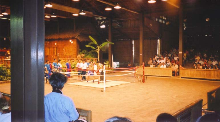 ツアーの一環としていろんな見世物見てきたけど、なかなか面白かったのが”やらせ”のムエタイ(笑) やらせでも結構楽しかったよ♪(写真:中央下) やっぱ身体の力はすごいな〜ってまじめに感動したけど。その後、ゾウのショーを見た。ゾウはなかなか利口だね。池に落とした木を拾い上げるし、人間の間を上手にまたいで歩くし♪