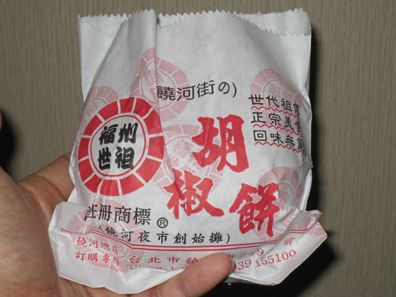 銀行で両替しようと思ったらパスポートのコピーではダメだと言われてしまい、しょうがなくホテルへ戻る。その途中に饒河街観光夜市に行ったときに食べて美味しかった胡椒餅が売ってたから買って食べる。ウマイね!!肉汁たっぷり♪