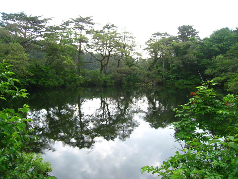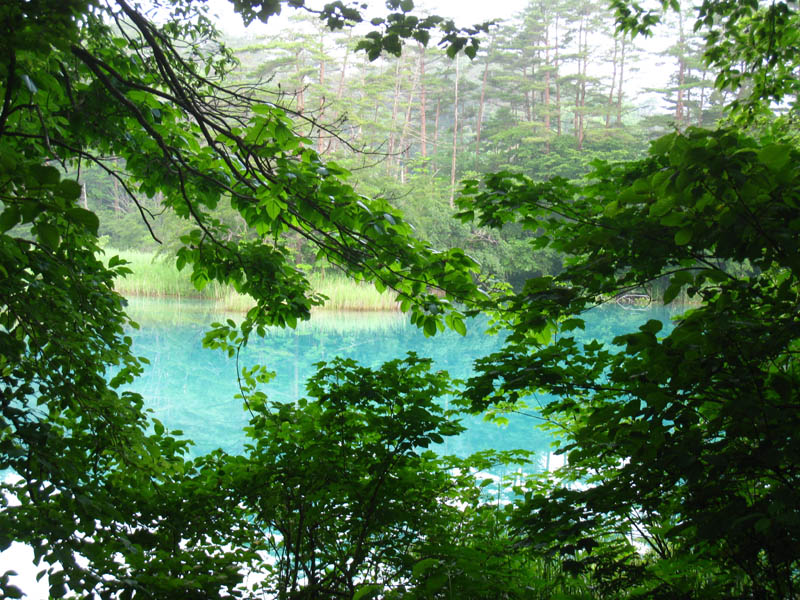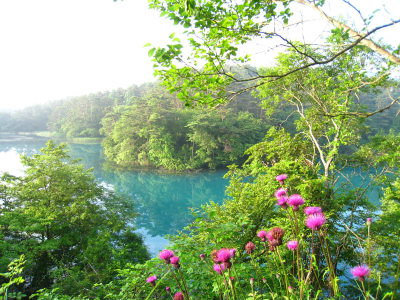 【コバルトブルーの沼、緑の木々の中に色鮮やかな花が美しかった♪】